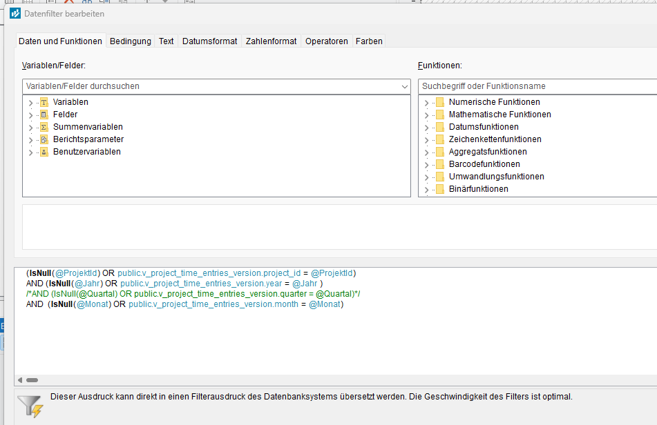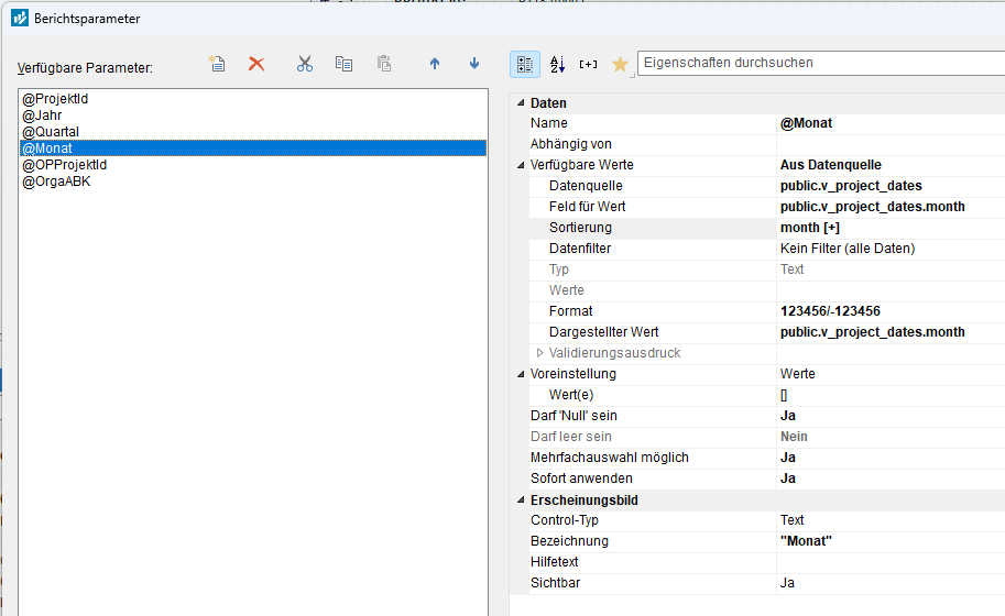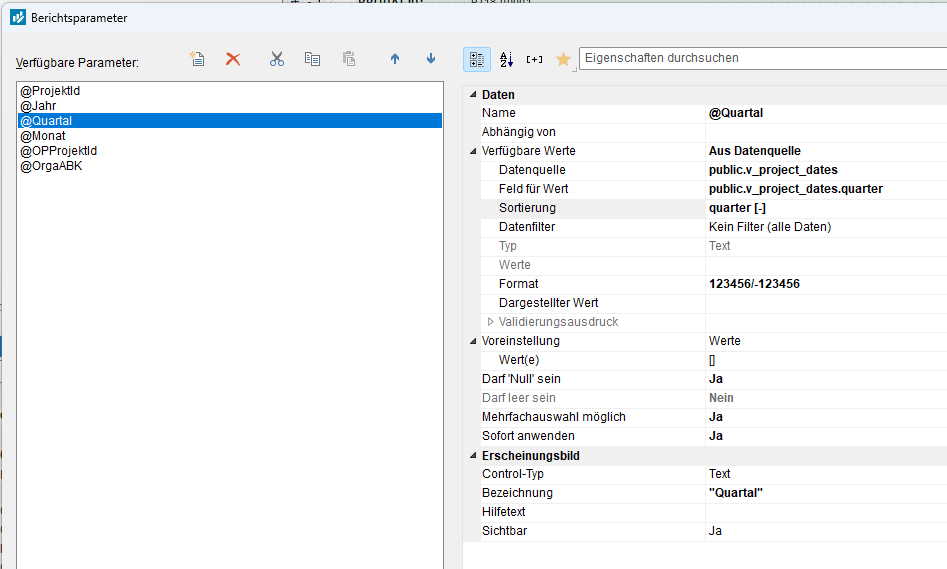vielen Dank. Das hat geholfen. Leider nur für den @Monat. Sobald ich das @Quartal in den Filter einbaue, bekomme ich einen Fehler. Sehe ihn beim Debuggen aber leider nicht. Kann es sein dass der Parameter nicht NULL wird wenn er als mehrdimensional gekennzeichnet ist?