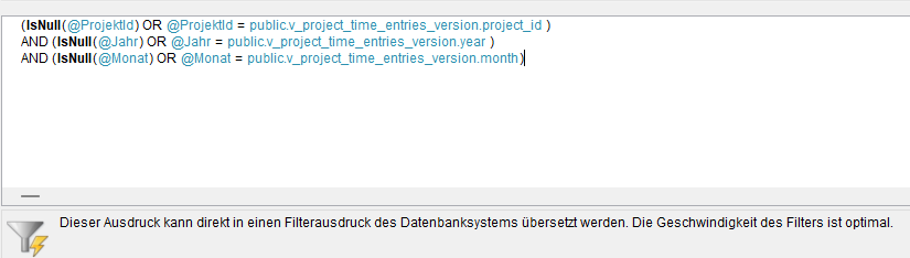 ich habe zwei Reportparameter in Mehrfachauswahl geändert. Beim ersten funktioniert trotzdem alles, beim 2. kommt “allgemeiner Fehler”. Es handelt sich dabei um zwei numerische Werte: Quartal und Monat. Den Monat hatte ich im Filter schon hinzugefügt und dort scheint der Fehler zu liegen. In der Doku steht, dass LL das normalerweise verwendetet (WHERE v_xyz.monat IN (@Monat)) aus (WHERE xyz.monat = @Monat) umwandelt, aber das scheint nicht der Fall zu sein. Denn wenn ich diesen Teil des Filters auskommentiere, funktioniert es fehlerfrei, aber eben ohne Anwendung der ausgewählten Monate. An anderer Stelle wo ich die Vorauswahl im Header anzeige, funktioniert Join() wunderbar. Ich hatte den Verdacht dass der Datentyp den Fehler verursacht, aber wenn ich den Monat als Text in der View ändere, kommt der Fehler trotzdem. Damit weiß ich echt nicht was ich noch probieren könnte.
