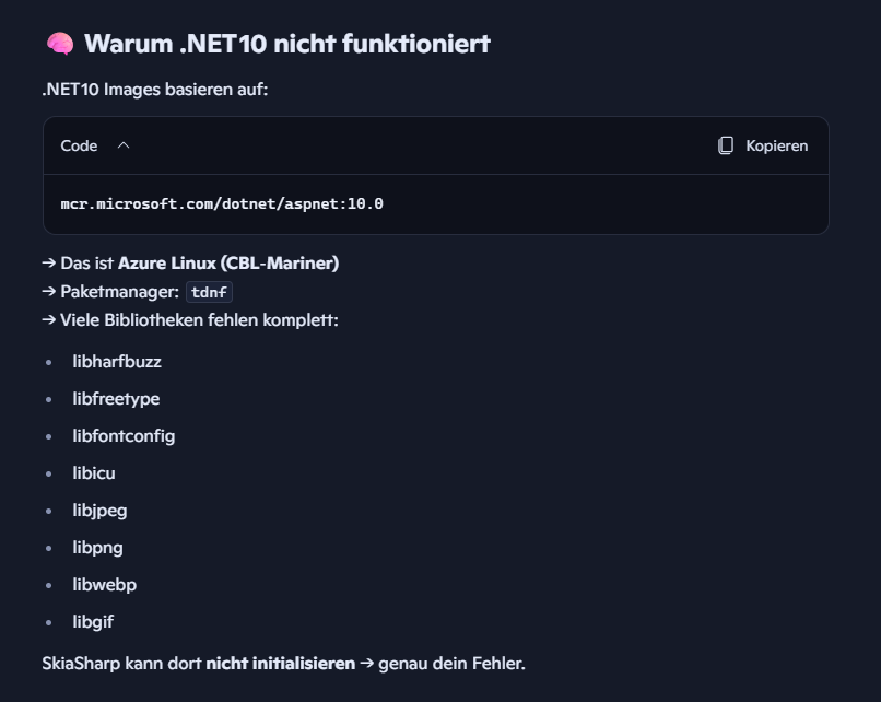 Dann dachte ich mir, okay dann füge ich diese über die Dockerfile hinzu und dann gehts los, aber leider wurde ich dann wieder enttäuscht. Nach etwas chatten mit AI wurde mir diese Antwort präsentiert: