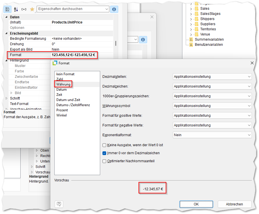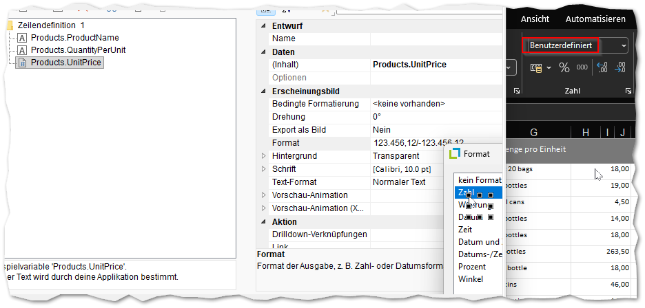 Mit dem Standardwert 3 (mit dem wir im Beispiel arbeiten) versucht List & Label, die im Designer gewählte Formatierung so exakt wie möglich in Excel wiederzugeben. Wenn die „Format“-Eigenschaft im Designer nicht verwendet wird, wird der Inhalt als Zahl an Excel übergeben, sofern er numerisch ist. Andernfalls wird er als Text übergeben.