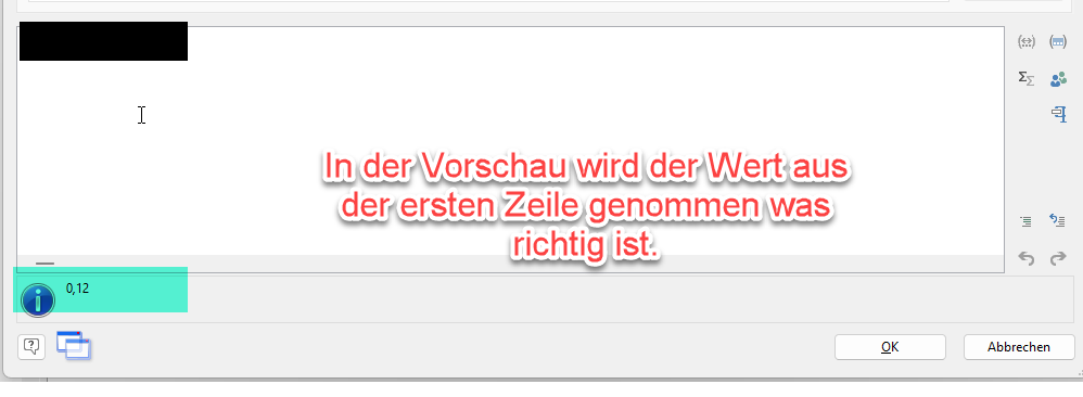 Schau ich mir die Daten in der Druckvorschau an so wird der Wert(0,10) aus der zweiten Zeile. genommen.