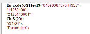 Barcode("~1" +“240”+ast_nummer+"~1" +“10”+astcg_nummer,“Datamatrix”)