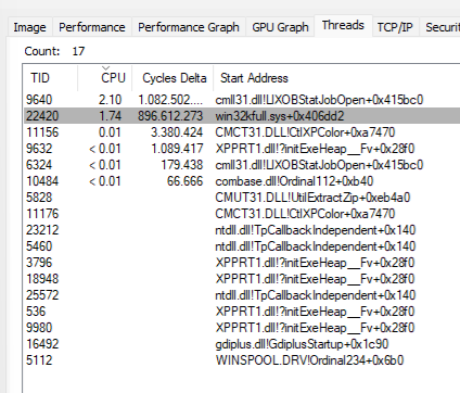 Debuggen zeigt mir dann, dass mein Thread sich entweder in LLPrintEnd oder LLPrint befindet. Die Prozess-CPU steigt auf ca. 4% (mehr kriegt der Prozess bei mir nicht) und wenn man mit dem Process Explorer in die Details geht, sieht man, dass zwei Threads sich diese 4% ca 50:50 teilen. Einer der beiden wildgewordenen Threads startete bei “win32kfull.sys+0x406dd2” und der andere bei “cmll31.dll!LlXOBStatJobOpen+0x415bc0”.