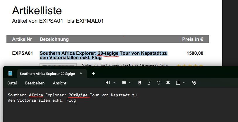 Ich hab es jetzt mit der Beispielanwendung und der Liste “Artikelliste mit Bildern.lst” nachgestellt. Ich habe die Schriftart auf Arial - Standard - 10 pt geändert, ich weiß aber nicht ob das relevant ist, in meiner Vorlage ist es halt auch so. Ursache ist jedenfalls, dass wir die PDFs als PDF/A-3u exportieren. Dann passiert es, dass ein Minus über die Zwischenablage nicht in Notepad eingefügt wird, vermutlich weil es ein “spezieller” Char-Code ist. Unten ist ein Screenshot dazu. Ich vermute, dass deshalb auch die Links nicht funktionieren.