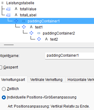 Daher habe ich auch ausprobiert die Verkettungsart teilweise zu “Individuelle Positions-/Größenanpassung“ zu ändern, denn soweit ich gesehen habe muss laut der Doku sich bei dieser Verkettungsart das verkette Element nicht im Eltern- Element enthalten sein.