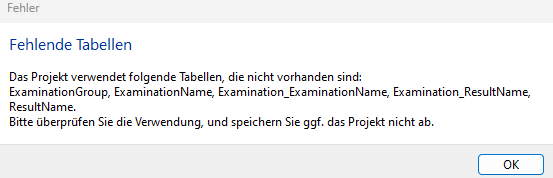 Wenn ich versuche die DataTables ohne Daten auszufiltern, dann bekomme ich eine Meldung, dass die verwendeten Tabellen nicht vorhanden sind.