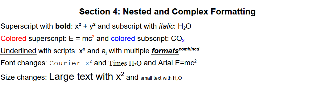 Der RTF Farbwechsel funktioniert nicht in LLC. Ich habe zum Test mal Rot und Blau alternierend verwendet. Hochgestellte Zahlen konnte ich durch die richtigen Unicode-Zeichen lösen.
