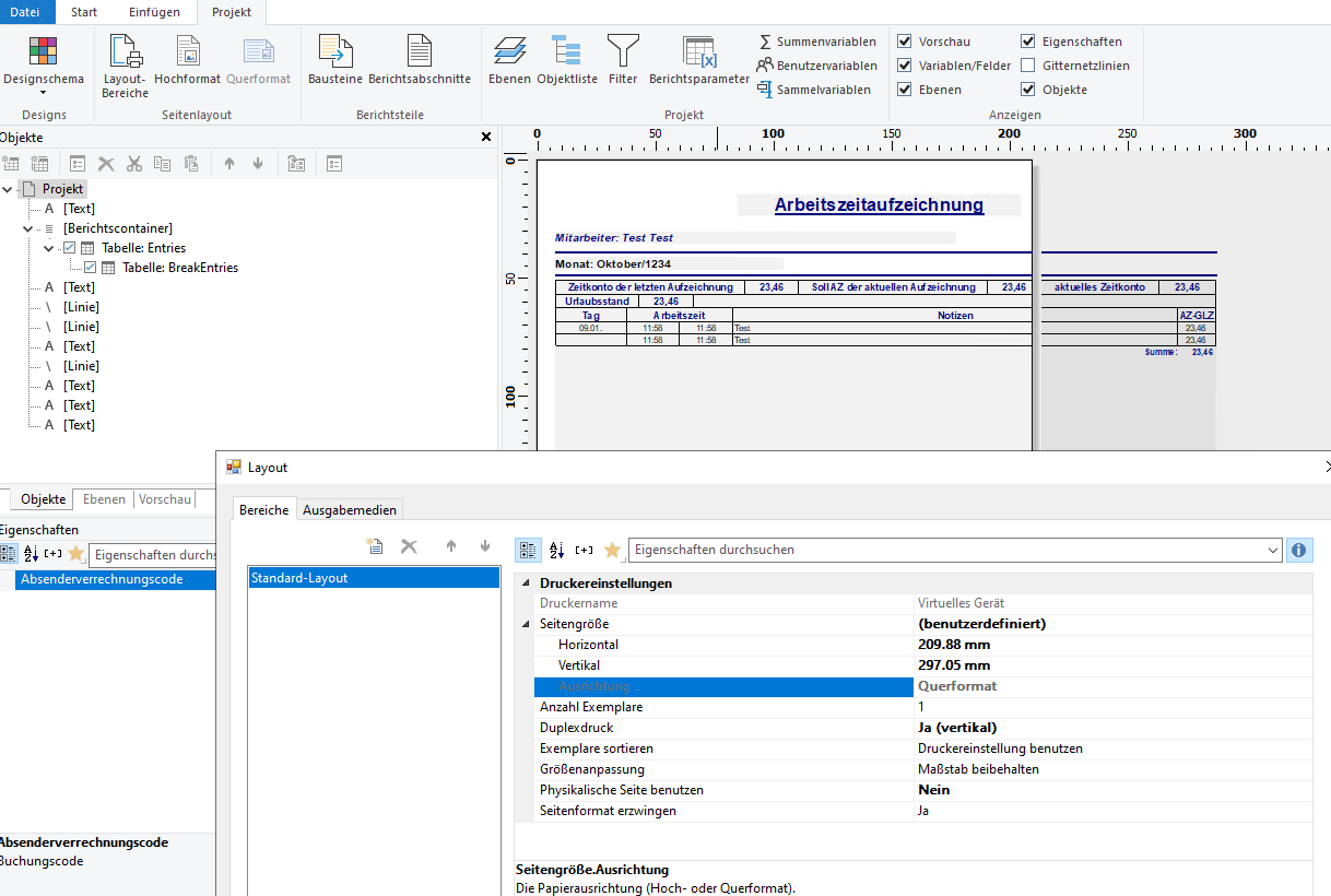 Könntest du außerdem die betroffene Berichtsdatei im Designer öffnen und schauen, wie dort die “Layout-Bereiche” in der Registerkartenoption “Projekt” eingestellt sind? Eventuell steht hier auch fest “Hochformat” drin und verursacht das Problem.