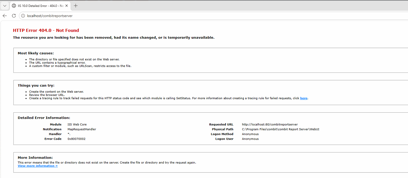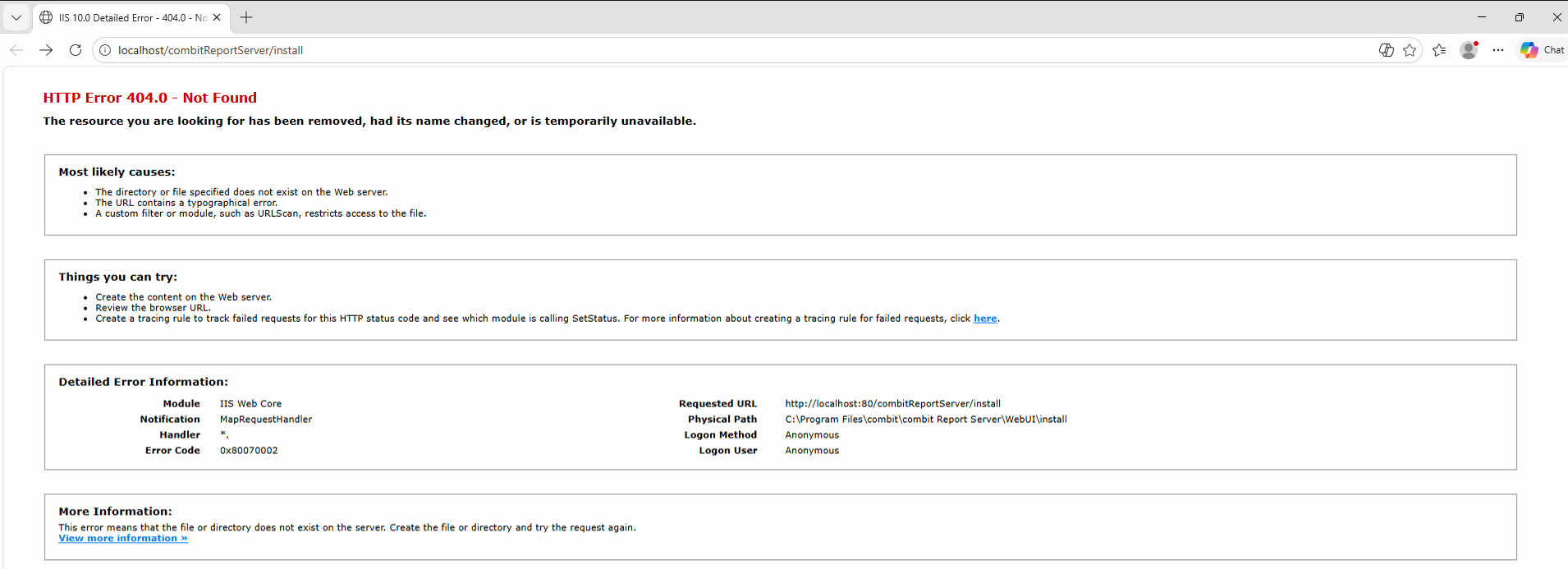 ich habe den ReportServer in der Version 30 auf einem Windows 10 Rechner installiert. Die Installation ist ohne Fehler durchgelaufen. Nach der Installation öffnet sich der Browser und versucht die URL ‘localhost/combitReportServer/install’ zu öffnen. Dabei wird aber ein HTTP Error 404 zurückgeliefert: